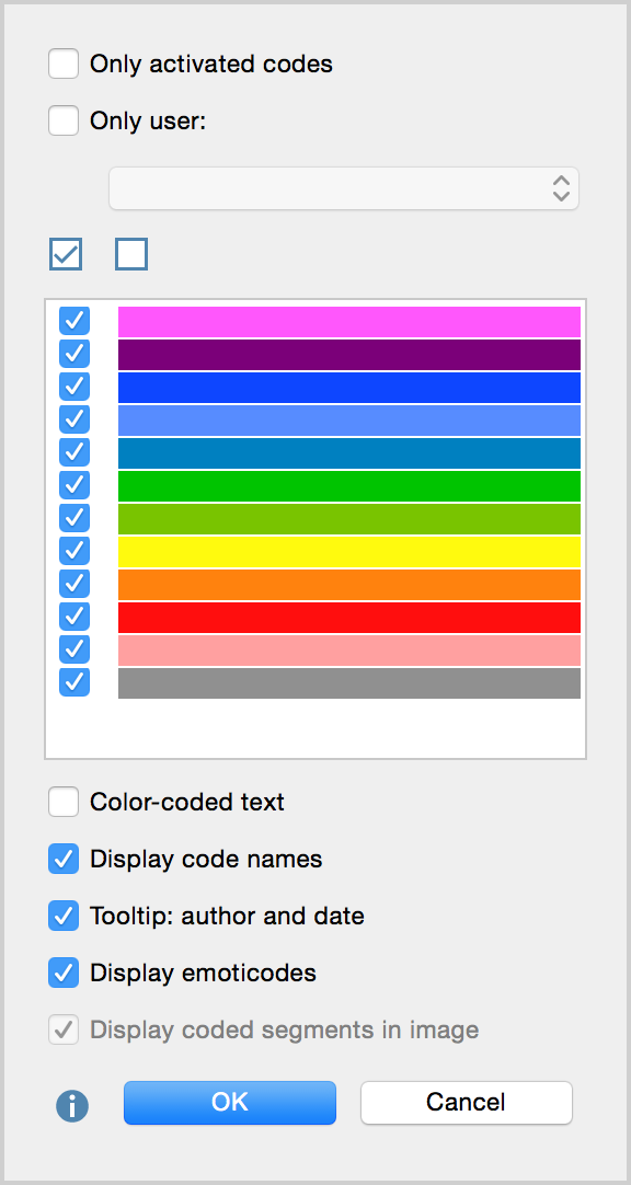 The option to switch off codes with selected colors is particularly useful when you are working in a team with independent coders. In this case, the coders should be defined as codes on the highest level of the code hierarchy and the different coders should use the same code tree organized as subcodes of the coders. Now, while the training the coders, you can hide the visualization of other coders’ work. Later on, they can compare their coding with the coding done by the others.