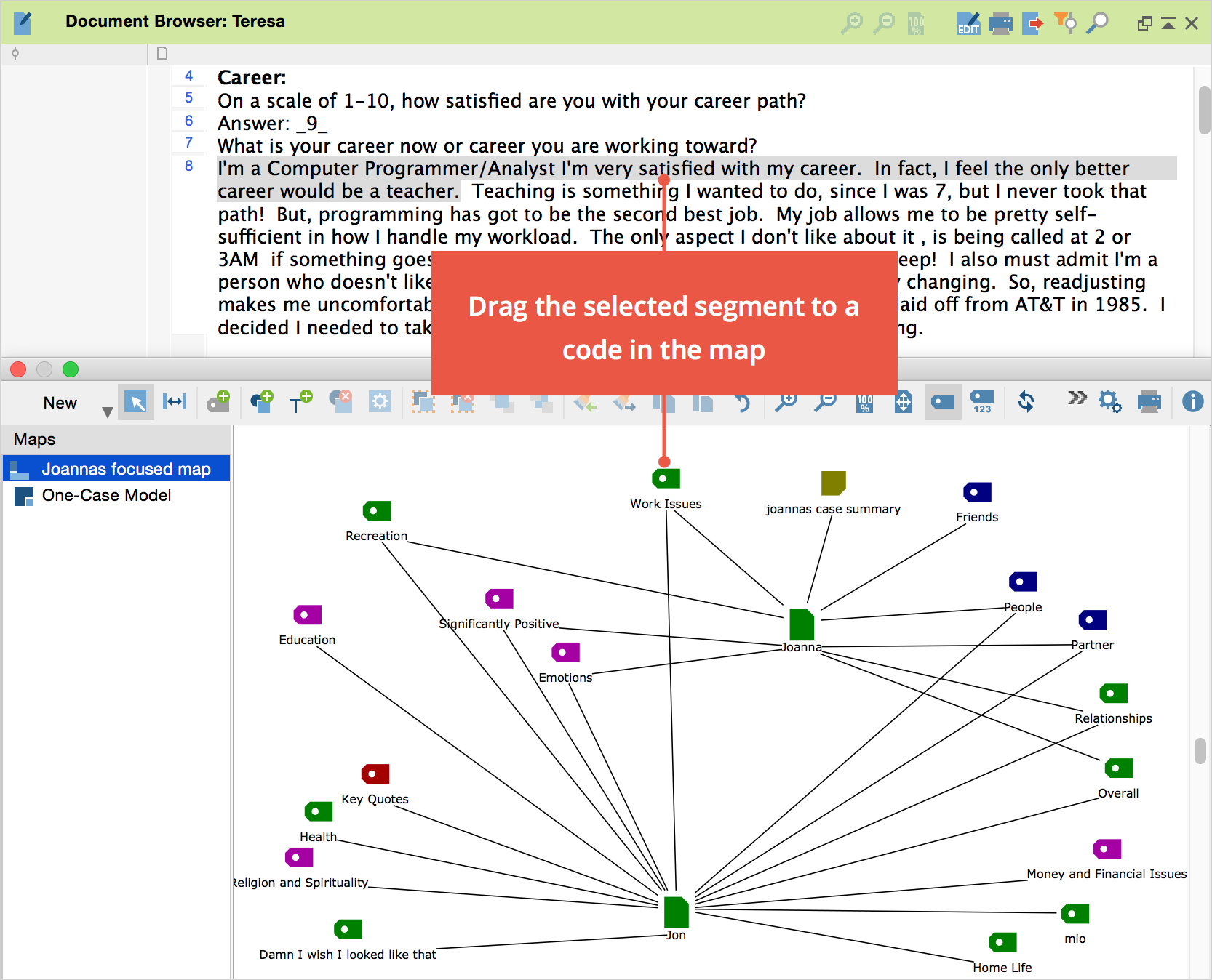Coding is simple: Drag a selected segment from the “Document Browser” to a code in the map.