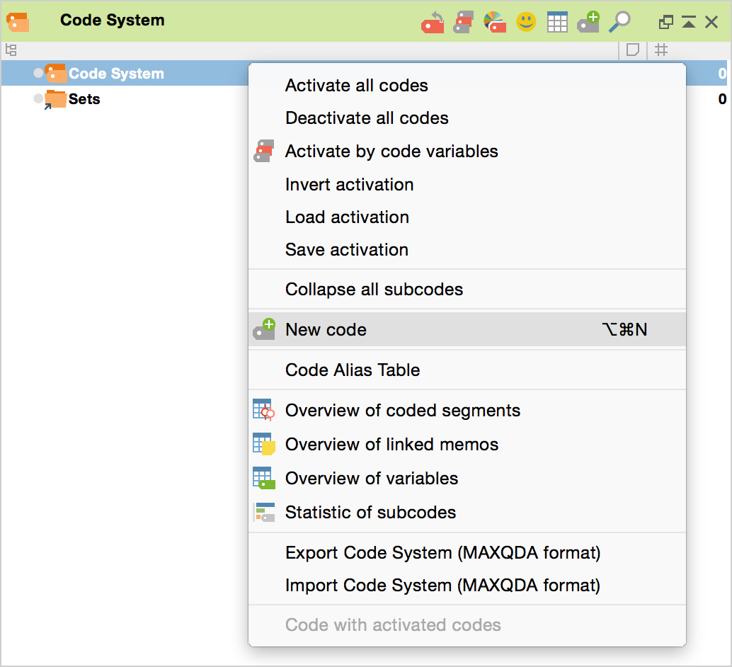 3. The third option is to create a new code by using the keyboard shortcut Alt+N (Windows) or cmd+Alt+N (Mac). For this to work, however, the “Code System” window must be selected.