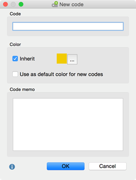 If you would like to define subcodes, just right-click the parent code and choose the option New code. Again the same dialog window as mentioned above will pop up. If you want the subcode to have the same color attribute as the main code, just click the checkbox “Inherit.”