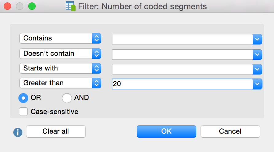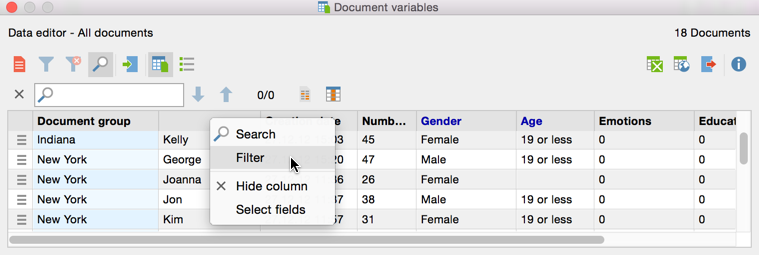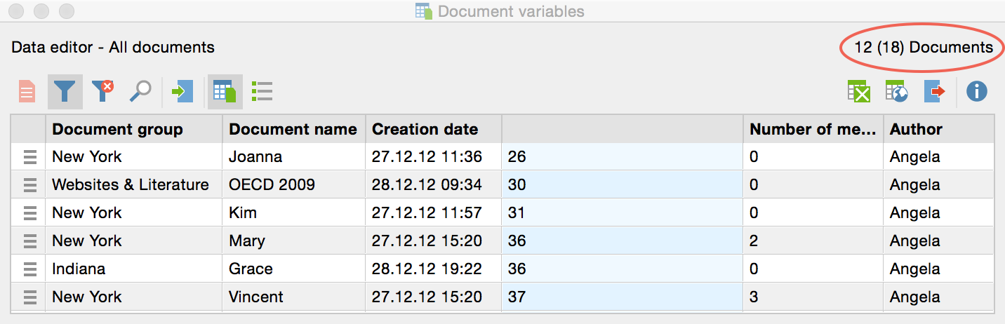 Table overviews can easily be filtered. For example, in the Data Editor you can display only the rows with documents containing more than 20 codes or whose names begin with “B”: