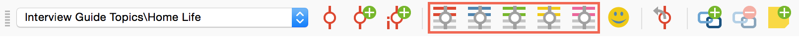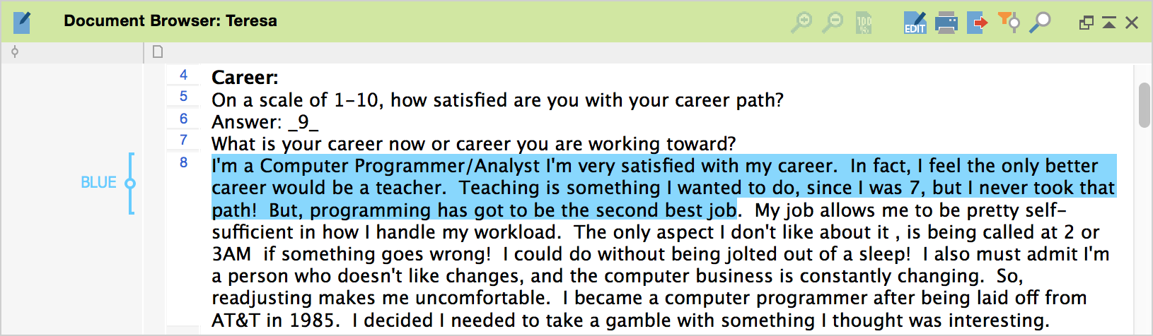To highlight code a segment of text, you follow a similar process as with standard coding: highlight the text segment with your mouse and click on one of the five colors in the toolbar. The text segment will now be highlighted in that color, and it will be coded accordingly. A new coding stripe will be visible in the coding column next to the document.