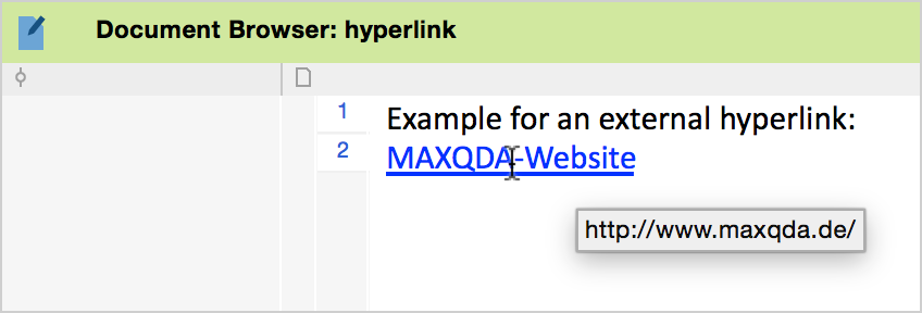Thanks to the expansion of the Internet, everyone knows what a link and what happens when you click on one. Documents imported into MAXQDA can also have hyperlinks in them. Clicking on the link in MAXQDA brings up the webpage or HTML file in the default browser.