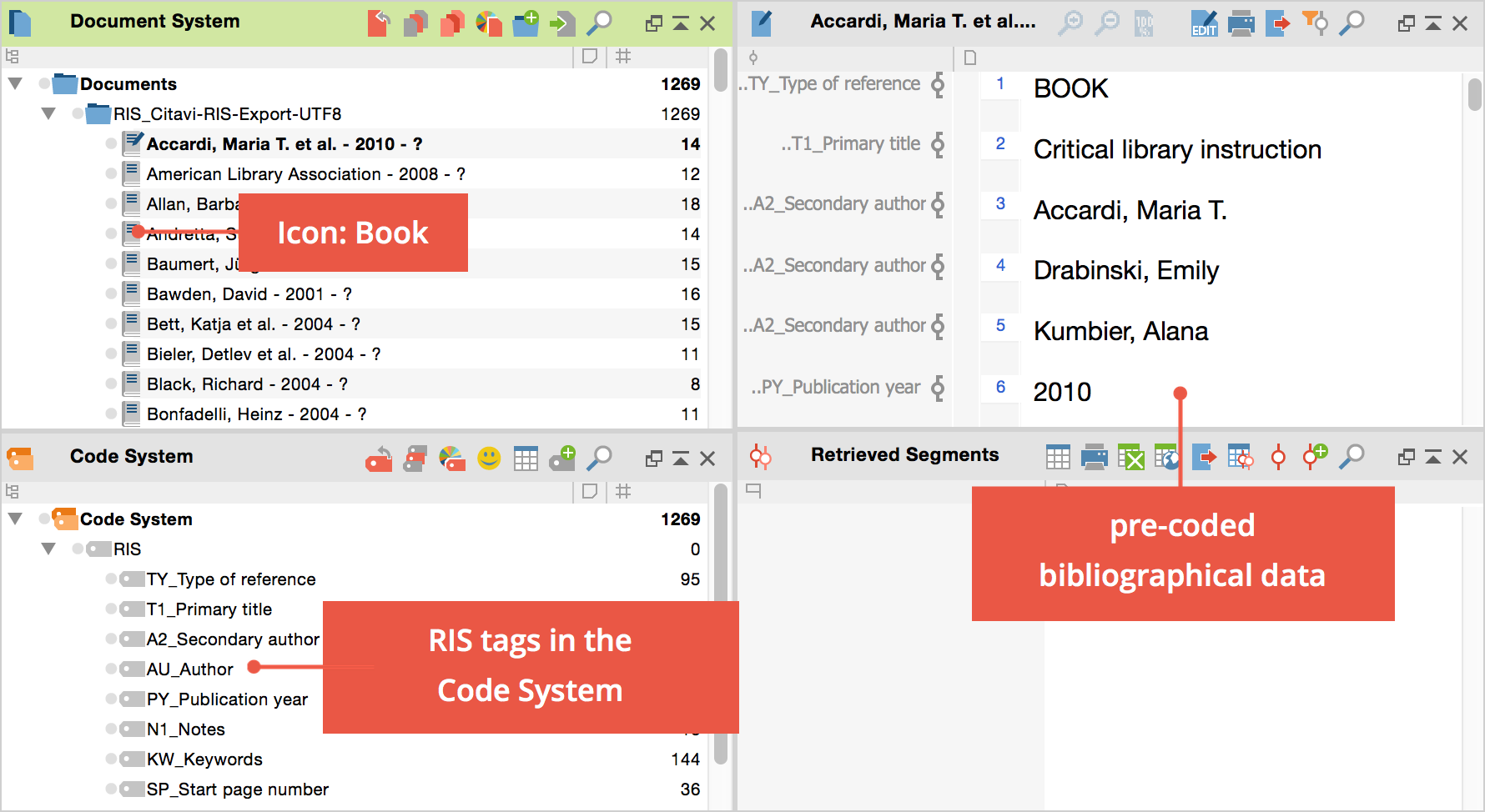 •All bibliographic entries in RIS format are added to the new document group as single documents; entries remain in their original order. The imported documents are indicated with a book icon in the Document System.