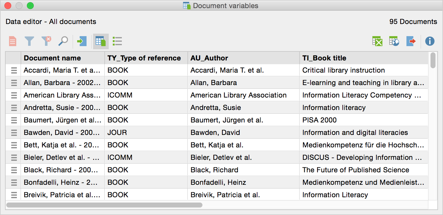 After selecting an export location, all documents in the project that contain bibliographical data (indicated with a book symbol) will be exported as RIS data (UTF-8 coding).