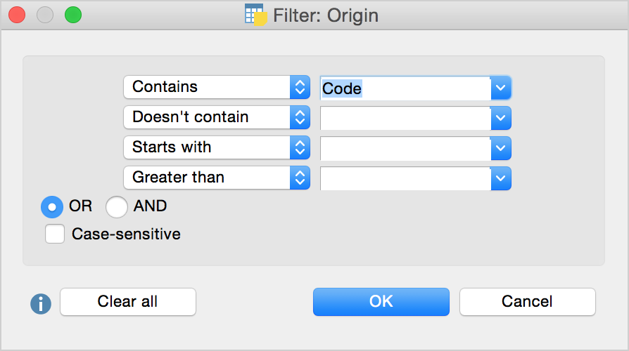 3. In the dialog box that appears, select “Contains” and enter “Code”: