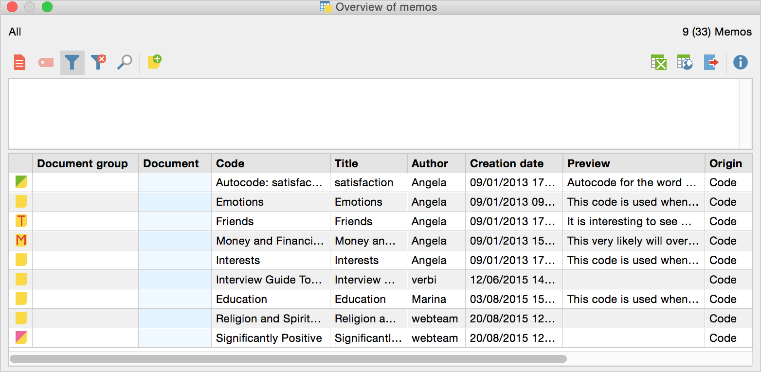 of all memos in the entire project can be called up by selecting Analysis > Overview of memos or by clicking on the