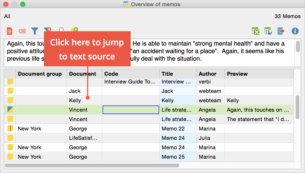 From each memo displayed in MAXQDA’s “Overview of Memos”, you can jump to the position in the document that the memo is attached to. You need only click on the desired memo with the left mouse button. The source document immediately appears in the “Document Browser” positioned exactly at the place where the memo is found.