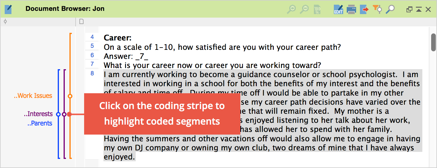 1. Select the segment by clicking on the corresponding coding stripe or code name in the “Document Browser”. The segment is now highlighted in the original text.