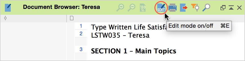Code Mode is active by default when a document is opened in the “Document Browser.” Click the Edit Mode button in the Document Browser toolbar to switch to Edit Mode. In Edit mode, the usual formatting functions such as selection of font color and size are available.
