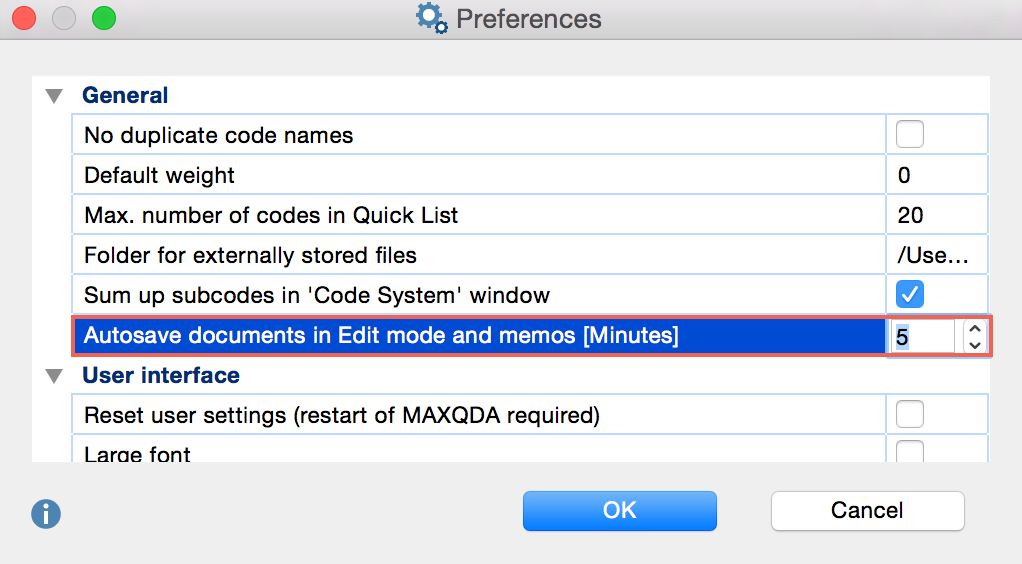 Note: Documents that are opened in Edit mode are automatically cached on demand. You can set the time interval under Project > Preferences (Windows) or MAXQDA12 > Preferences (Mac) (by default, the open document will be saved every 5 minutes). The edited text will be saved automatically when you switch back to coding mode or close MAXQDA.