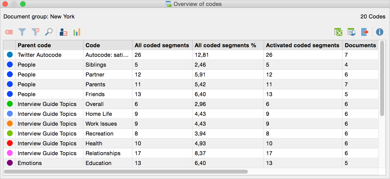 A table view of all of the codes that occur in the relevant documents will appear. The table may contain more or fewer lines depending on the place in the program from which it was called up. In the title of the overview you can see which documents the overview applies to and to how many (different) codes in the document a segment is assigned.