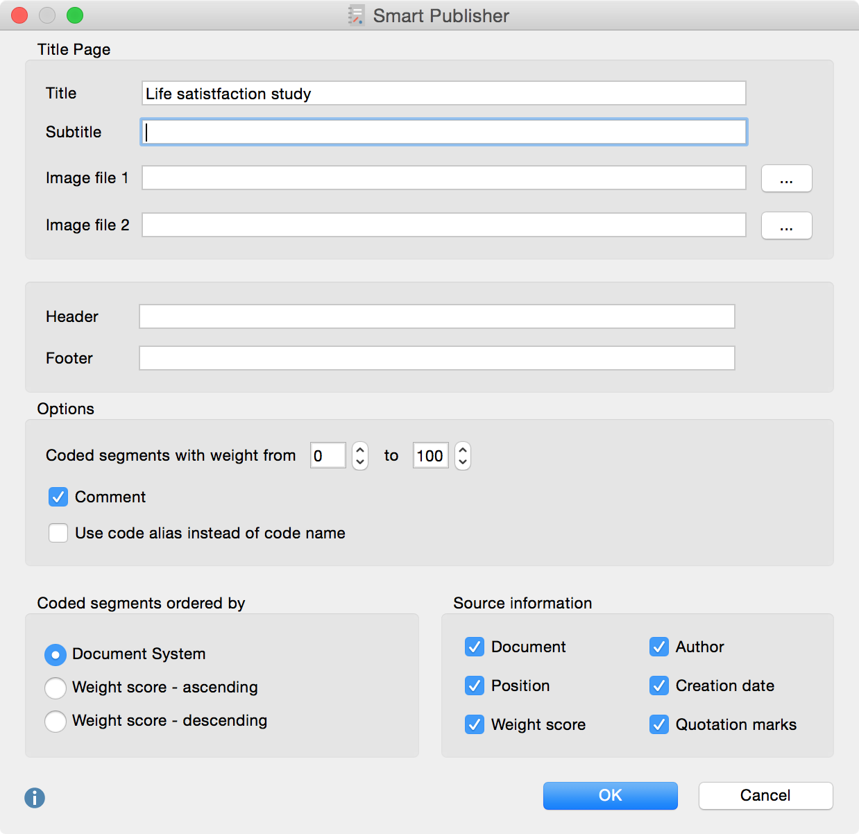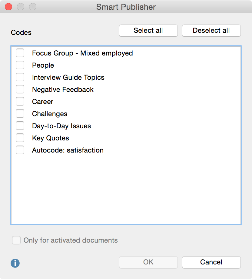 When Smart Publisher is called up, a dialog window will appear in which you can select the codes to be included in the report. When top-level codes are selected, their corresponding subcodes will automatically be included in the report. You can also choose to include coded segments only from activated documents.