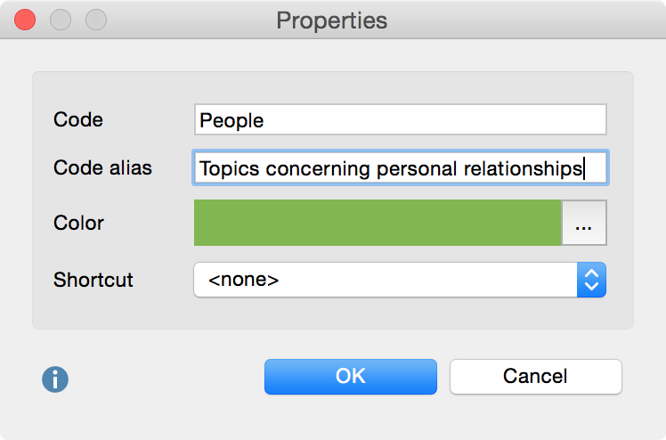 In order to assign a code alias, right-click on the code in the “Code System” and select “Properties”. A dialog window will appear, in which you can enter the code alias.