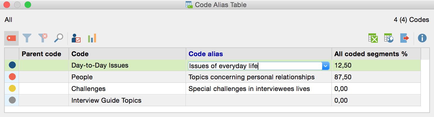 Smart Publisher uses the code names from the “Code System” as headings for the individual subchapters of the report. However, you may wish to assign an alternate name to some or all of the subchapters in the report. This may be the case if the 63 characters per heading allowed by the system are not enough, and you wish to create a longer name, or if, in other cases, a shorter heading would be more appropriate. For this reason, MAXQDA allows you to create a “code alias” of up to 225 characters.