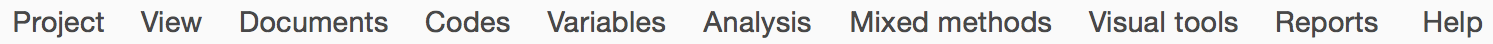 This menu offers several visualization function options: MAXMaps, the tool for qualitative modeling; the Code Matrix Browser (documents by codes); the Code Relations Browser (code co-occurrence); and the Document Comparison Chart are all for numerous or all of your documents; and the Document Portrait and Codeline visualizations apply only to one document at a time, which means that they can only be selected when an appropriate document is opened in the “Document Browser”; the tag cloud vizualises the 50 most-frequent words of all text, PDF and table documents and can be adjusted with a stop list.