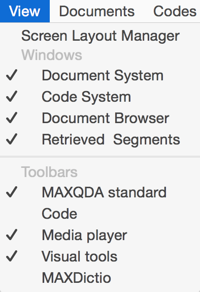 With a screen width of over 1,440 pixels, MAXQDA 12 uses a three-column layout by default. This takes advantage of the widescreen format of modern monitors better than the traditional four-window layout, which has long been a characteristic of MAXQDA. You can easily change back to the traditional four-window view with the help of the “Screen Layout Manager.” This is appropriate for screens with normal formats.