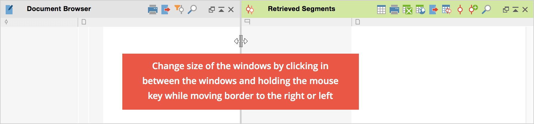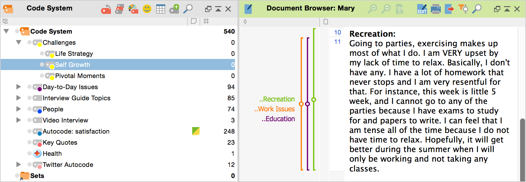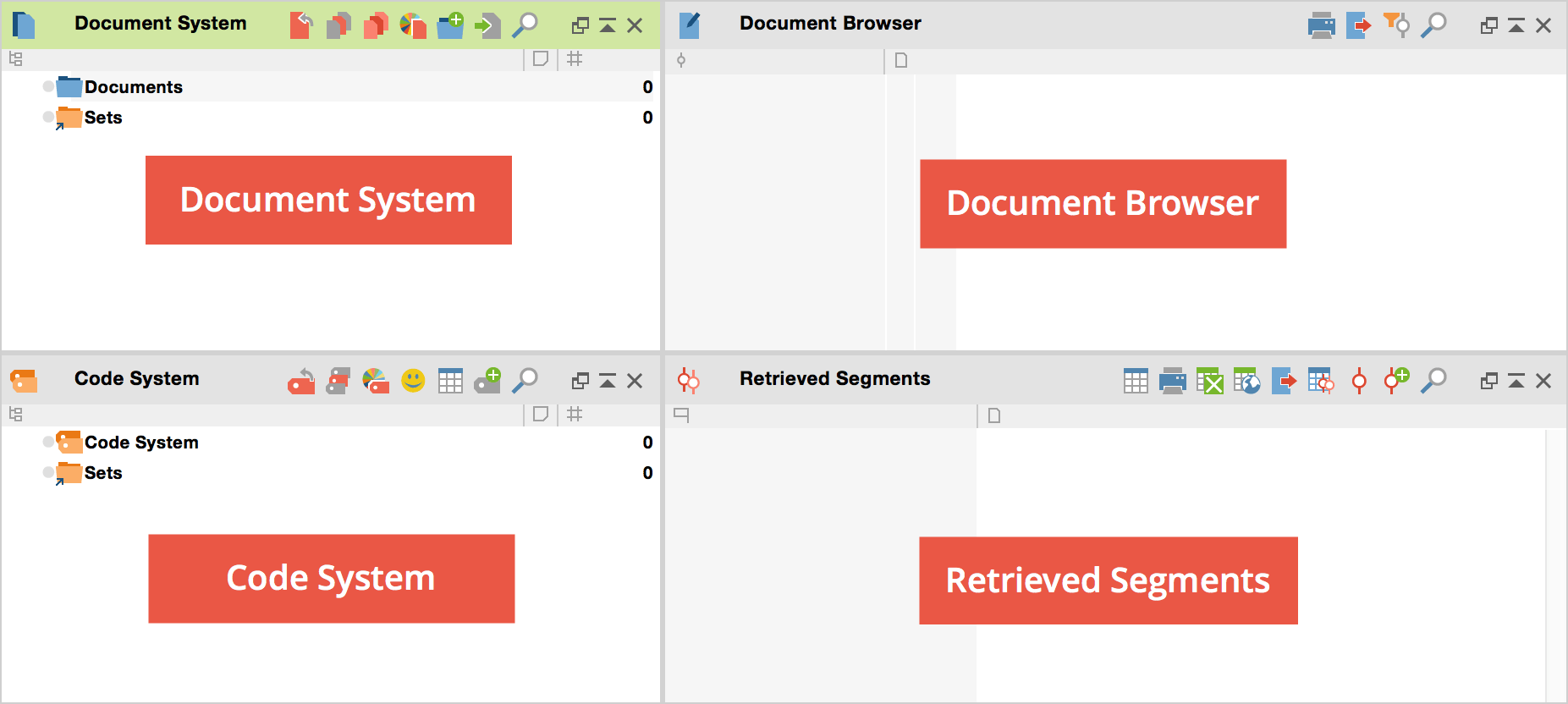When coding a document, it is sometimes helpful to close the “Document System” and “Retrieved Segments” window, so the “Code System” and “Document Browser” are larger. The “Document Browser” can then be made even bigger by dragging the border in the direction of the “Code System.”