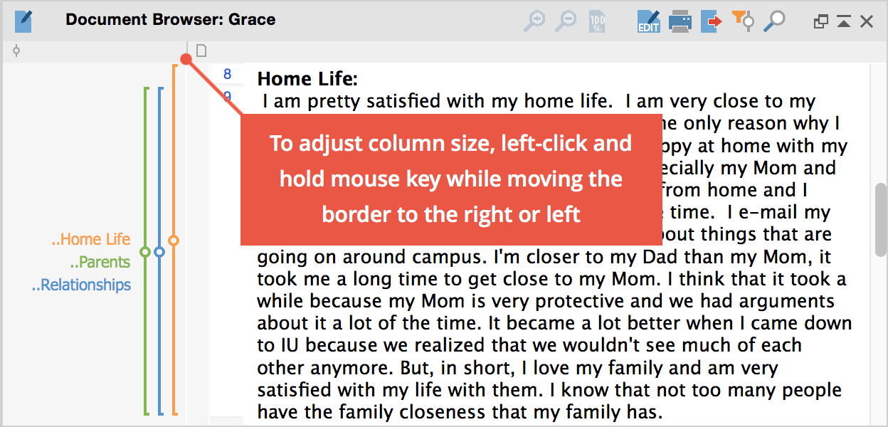The “Document Browser” window includes the coding column, a gray area left (or right) of the text document in which codes are displayed. To adjust the width of the coding column, move the mouse pointer to the top of the line separating it from the document, press the left mouse button, and drag the column to the left (or right) side of the text.