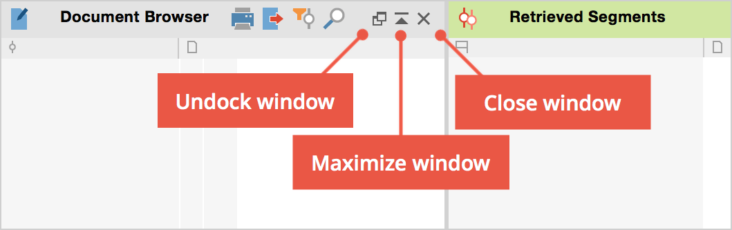 Each window has a toolbar, which gives you quick access to frequently-used functions. By hovering over each symbol, you can see what each symbol does. Symbols that are found in more than one toolbar always have the same function, such as:
