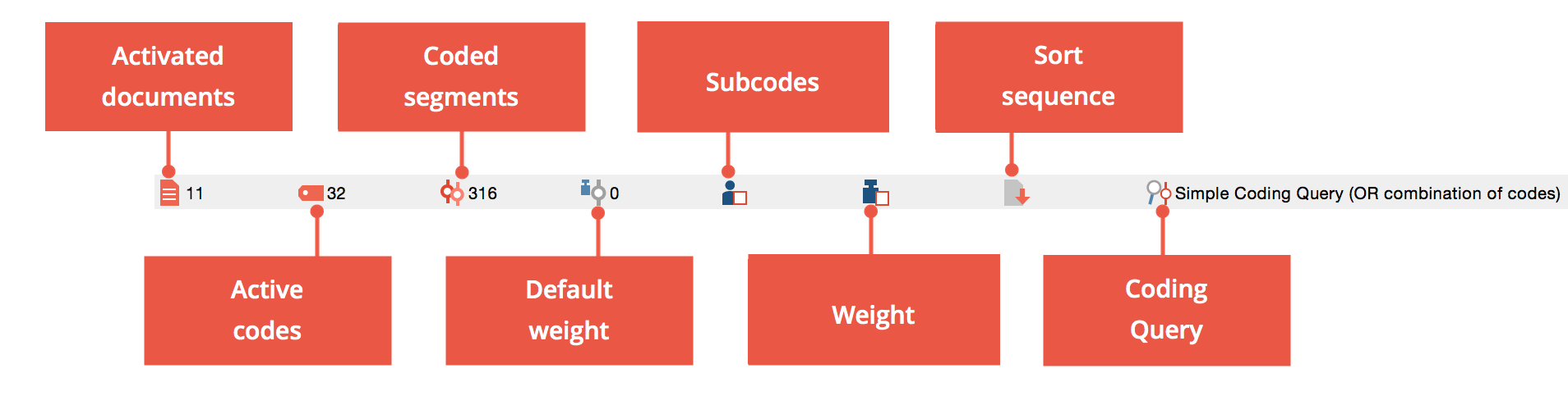 At the bottom of the MAXQDA screen, you will see a status bar that includes information about various aspects of your current workspace (e.g. the number of activated documents and codes, the number of retrieved segments, the current retrieval option, etc.)