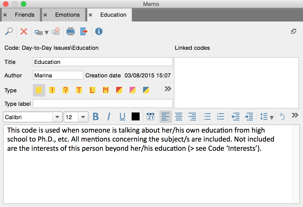 When creating a memo, you can simply move from one field to the next, entering all the information that is required. MAXQDA automatically inserts the currently logged in user as the “Author,” so that you can later find all memos by author. You also have the option, though, of changing the name in this field. The memo’s “Creation date” is also inserted automatically.