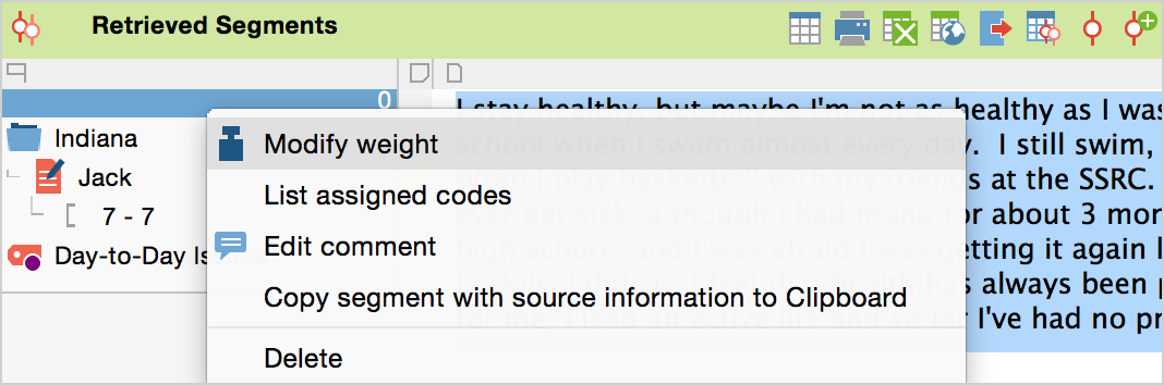 A weight score can also be assigned and modified in the “Retrieved Segments” window. Right-clicking anywhere on the information box left of the coded segment opens the context menu, where you can select Modify weight and enter a number between 0 and 100.